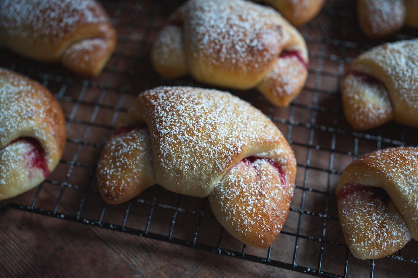 Shaping the dough into crescents, however, was a little more of a challenge. The instructions are simple enough - split the dough in half and roll out each into a disc. Cut each into 6 triangles, add a dollop of jam and then roll them up before curving them into little crescents.