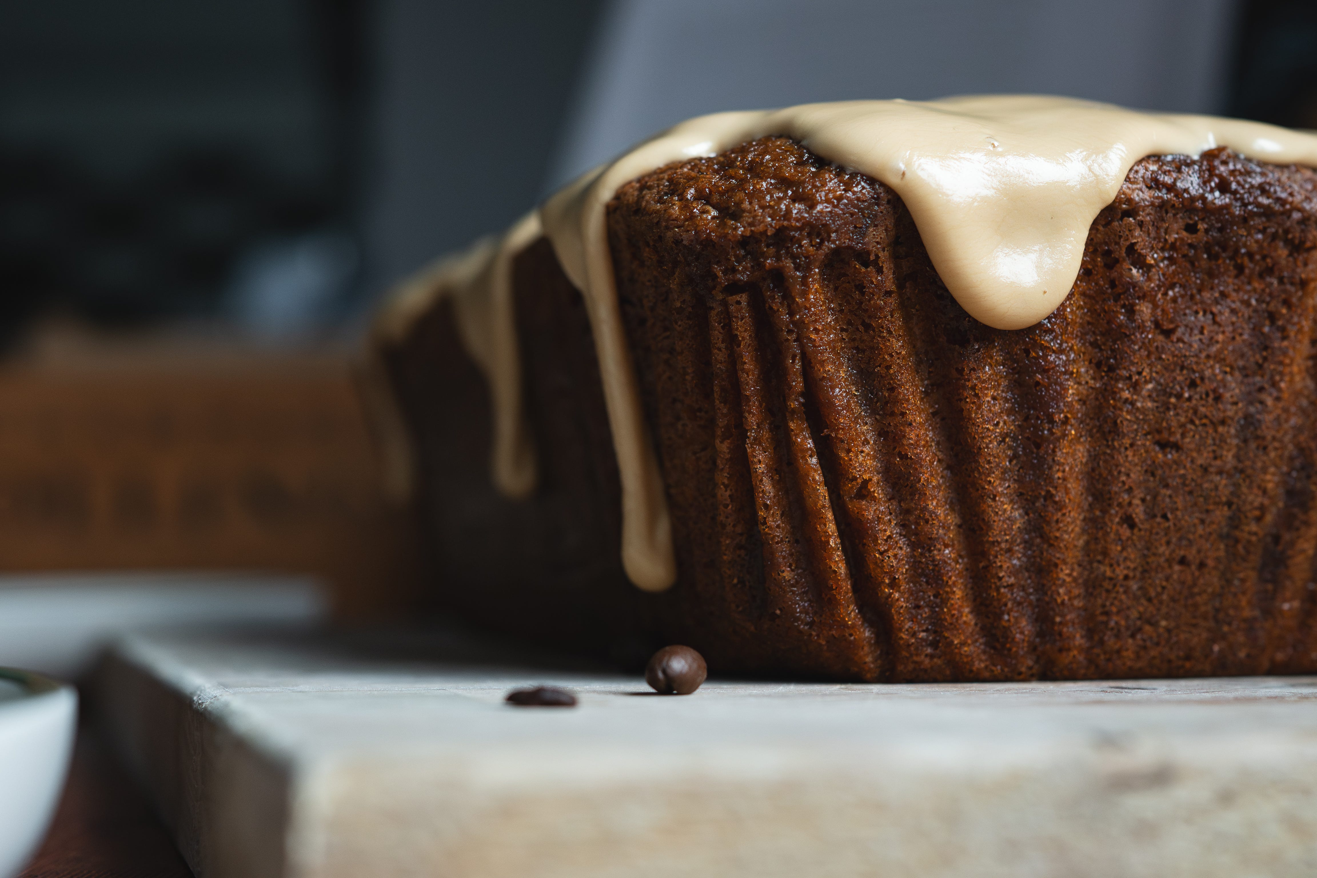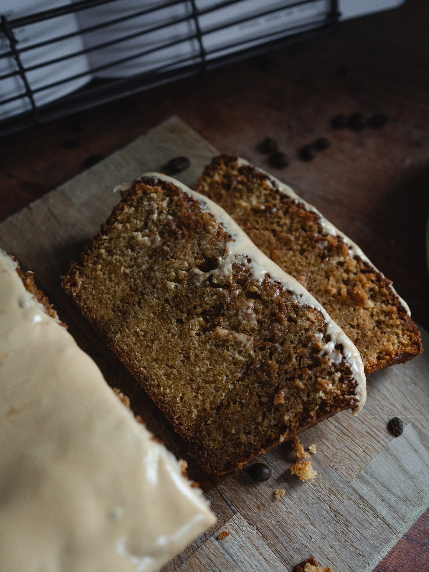 Once baked, the cake is soaked in a sweetened latte mix and topped with an espresso icing glaze.