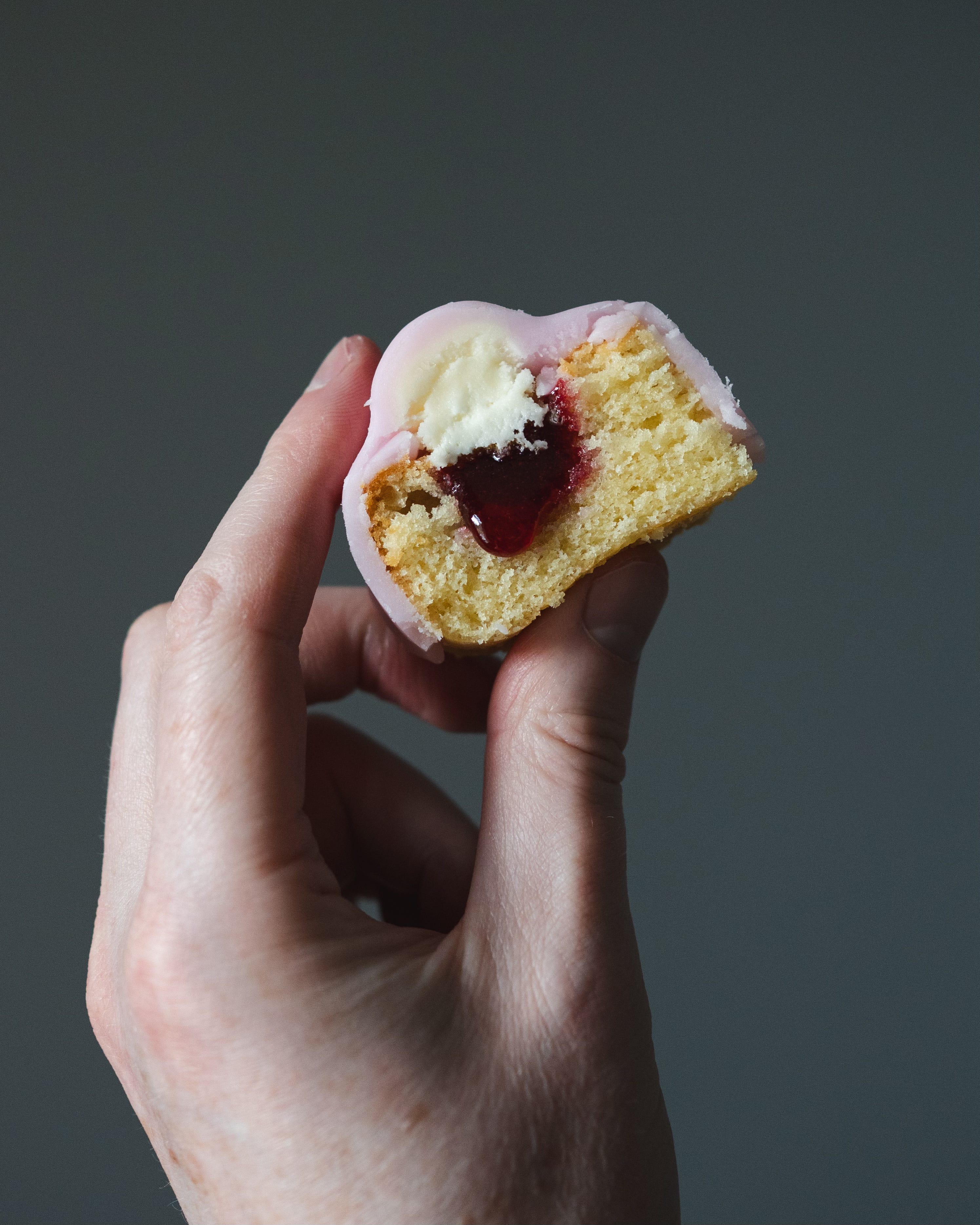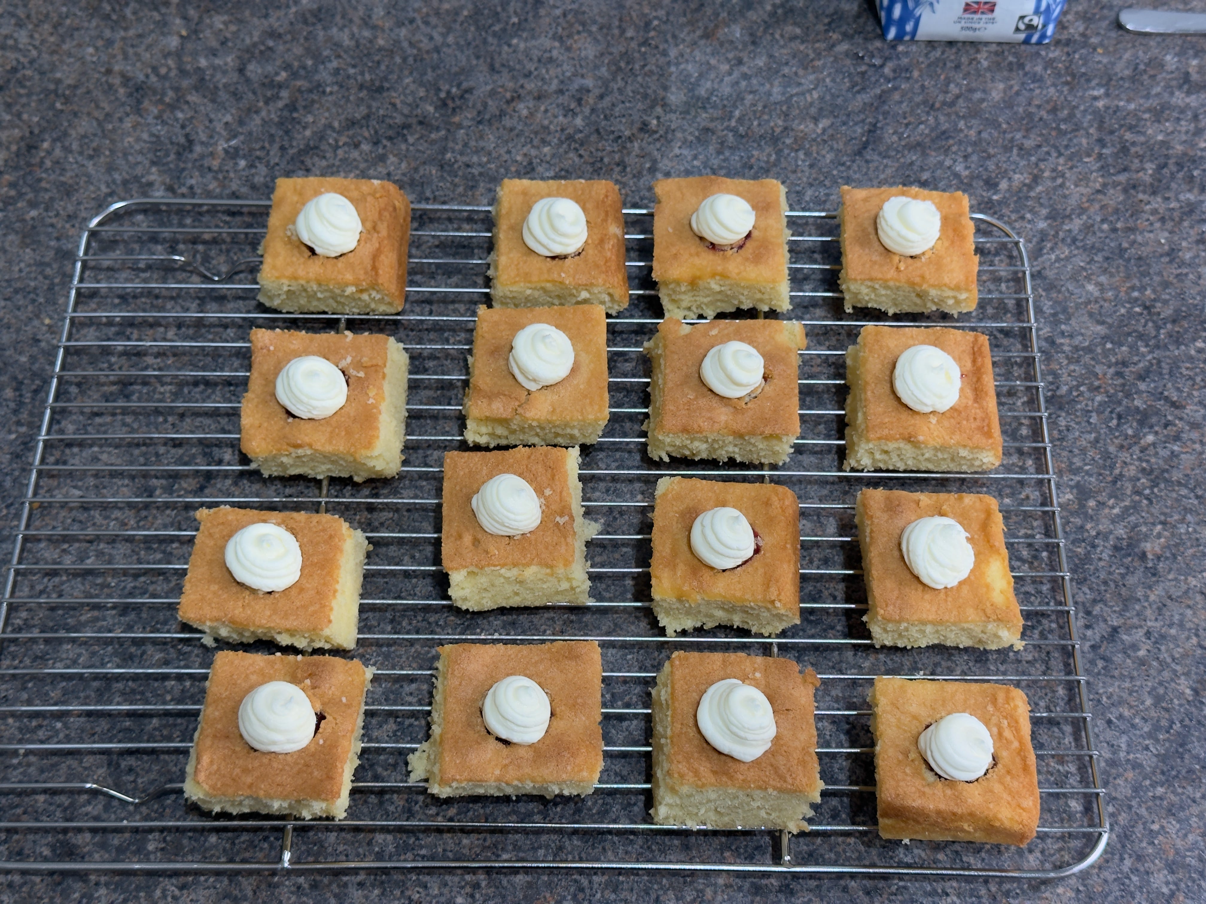 I measured the sponge into exact little cubes, hollowed out the centres and piped in the jam. I then popped the lids back on and piped the domes of buttercream on top. Honestly, at that stage I thought I might actually pull this off.